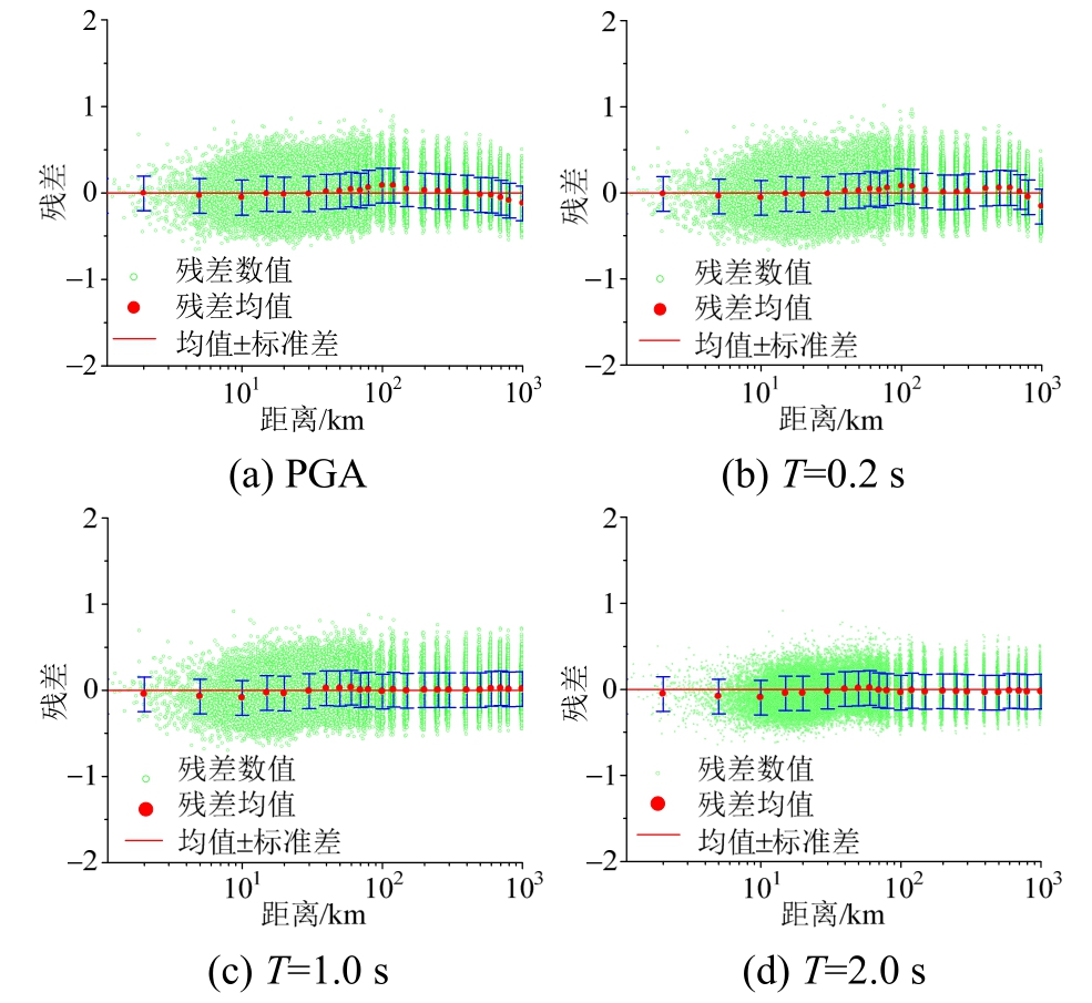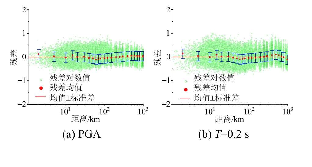 图7和图8展示了残差随距离分布的情况,因篇幅限制只列出M=6.0和M=8.0时的残差分布图。由图可知,残差随距离的增加没有明显的增加或减小趋势,说明回归具有较好的稳定性[1]。