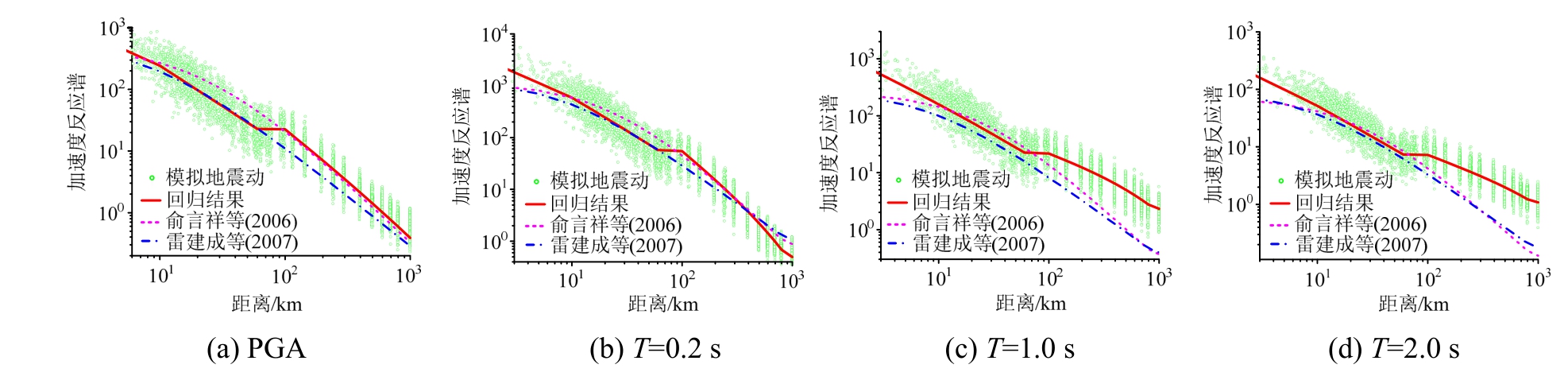 2) 在10 km~100 km范围内,本文回归公式与雷建成等(2007)针对四川地区的预测公式很接近,但俞言祥等(2006)针对中国西部地区的预测公式则明显给出更高的幅值。但大约 100 km以上,其他两个预测公式都表现出快速下降的趋势,此时本文回归公式则给出了明显高的PGA值[1]。对于T=0.2 s的PSA值,在100 km内与PGA情况相似。
