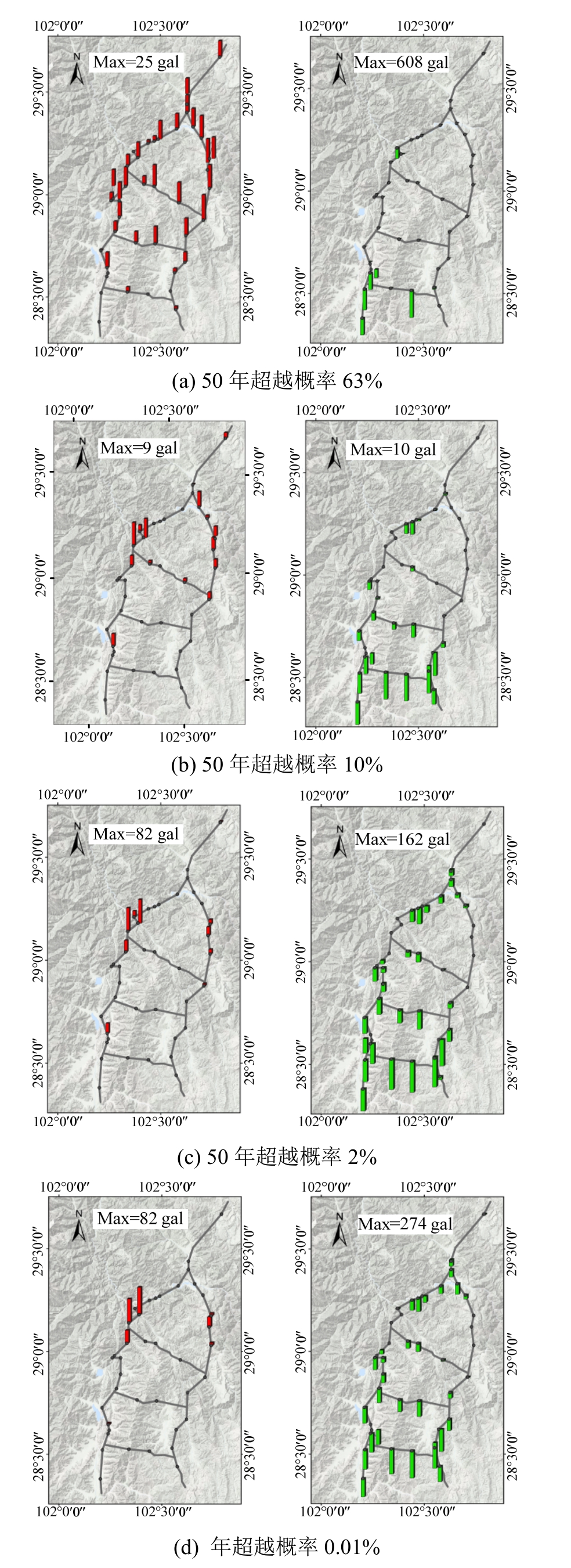 由图11~图14可知,随着设防水准的提高,本文方法给出的PGA、PSA值相对传统风险曲线给出的值逐渐降低。在多遇地震水准下,本文方法给出的PGA、PSA值在绝大部分桥梁节点处高于传统风险曲线给出的参数值,这意味着在多遇地震水准下,采用本文给出的风险曲线更为安全;在偶遇地震水准下,路网东北部桥梁节点处,本文方法给出了更高的PGA、PSA值,而路网西南部的桥梁节点处本文方法给出的PGA、PSA值则相对较低;在罕遇地震和极罕遇地震水准下,本文方法给出的PGA、PSA值在绝大部分桥梁节点处都低于传统风险曲线给出的值,意味着传统地震风险曲线在大震情况下更为保守[1]。