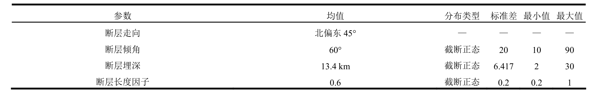 破裂面的长度和宽度,由矩震级和断层长宽之间的经验关系直接计算[39]。为充分考虑破裂面尺度的不确定性,在破裂长度、宽度均值的基础上再乘一个符合截断正态分布的修正因子。参照Atkinson和Boore(2006)的做法,最终取该修正因子符合(0.2, 1.0)区间内的截断正态分布,均值为0.6,标准差为0.2[11]。