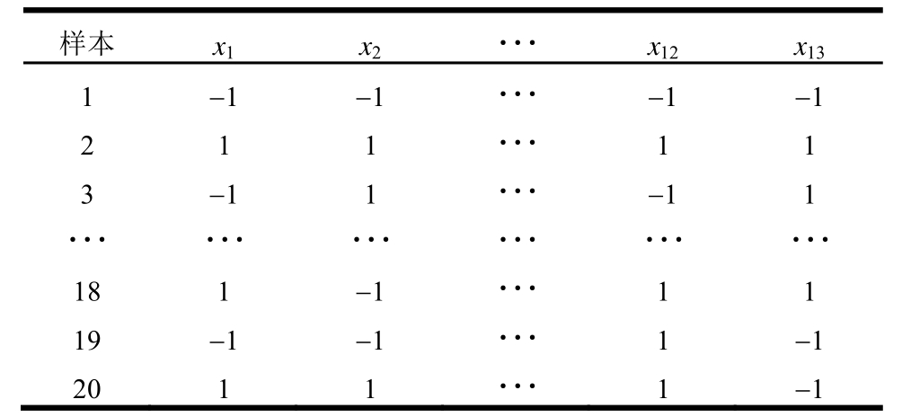 Plackett-Burman设计是 1946年 Plackett和Burman提出的一种两水平(-1,1)的试验设计方法,该方法试图用最少的试验次数达到从众多的考察因素中快速有效地筛选出最为重要的几个因素,供进一步研究使用[14]。本文对选出的7个结构参数和6个材料参数进行 Plackett-Burman设计,生成 20个两水平的桥梁样本,并用-1和1分别表示桥梁参数的最小值和最大值,具体如表2。对桥梁样本进行非线性动力时程分析,进一步刷选出对桥梁响应影响较大的显著性参数。