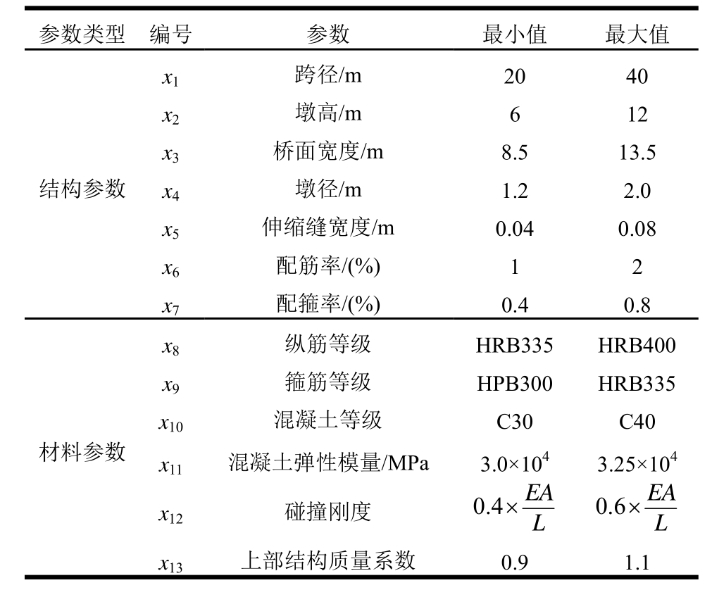 综上所述,本文选出可能影响桥梁地震响应的13个输入参数:7个结构参数和6个材料参数,并给定各参数的取值范围,具体如表1所示。