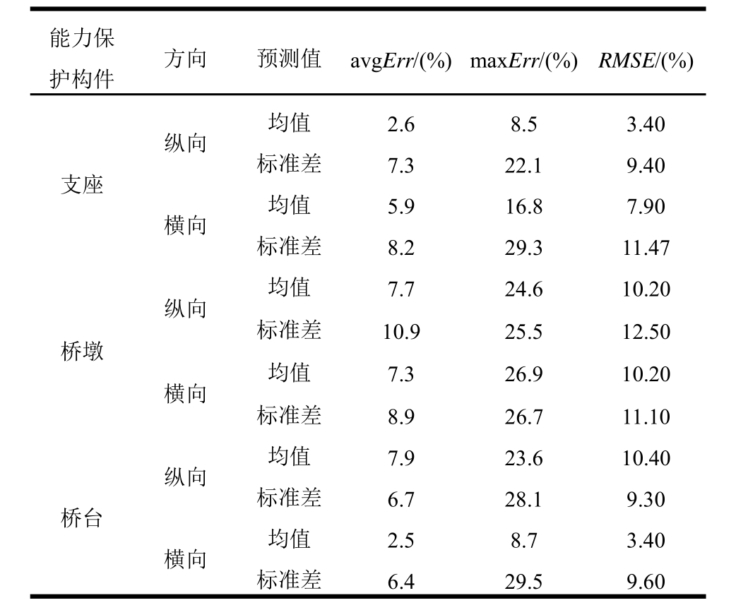 由式(11)~式(13)可得不同 PGA 作用下桥梁各能力保护构件的实测值与响应面预测值的三个误差。本文拟合出地震动强度下的响应面函数,每个PGA作用下桥梁纵横方向12个误差判定值,总共计算得到120个误差评定值,考虑篇幅,将各地震动强度下(0.1g~1.0g)的误差取最大值,得到三个能力保护构件纵横两个方向的误差汇总,如表6所示。