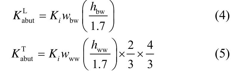《公路桥梁抗震设计细则》[17]中仅仅给出了地震时桥台主动土压力的计算公式,并没有对桥台的力学模型进行描述。本文根据美国《加州桥梁结构的非线性分析指南》基础上建立简化桥台模型[18]。具体建模如下:首先在主梁边跨建立与主梁纵桥向垂直且等宽的两个边节点,两两节点之间通过刚臂单元连接。在同一位置再构建一条相同的刚臂,两刚臂之间采用零长度单元连接并赋予碰撞材料特性。桥台垂直方向的约束刚度依据美国加州桥梁抗震设计规范取值[19],横桥向约束刚度依据Maroney和Chai (1994)提出的方法计算取值[20]。桥台纵横桥向初始刚度如下式: