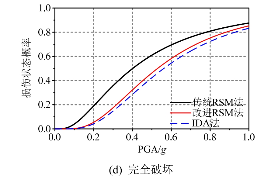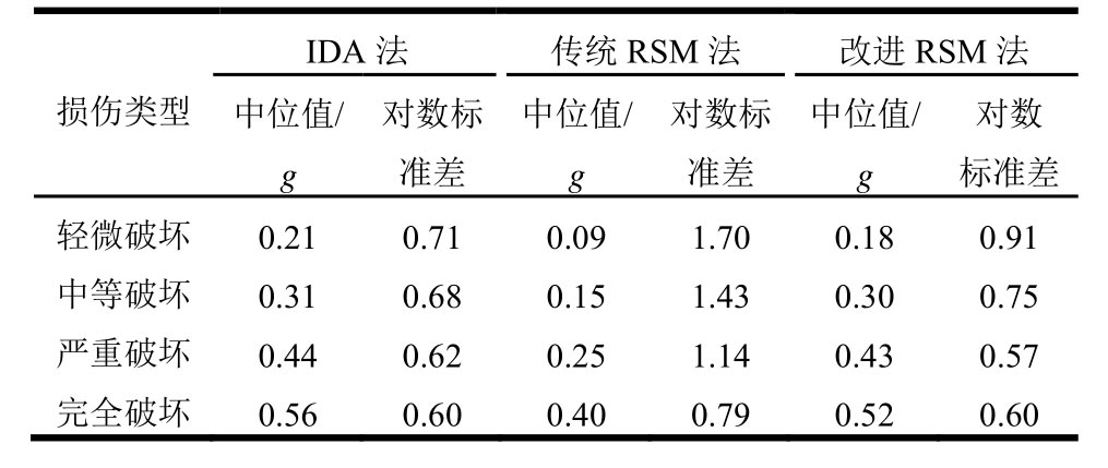 从图6可以看出,以IDA法得出的易损性曲线为基准,把 PGA独立出来的改进响应面法将明显提高预测真实地震响应的精度,从而提高易损性曲线的精确性。由表9可知,传统响应面法生成的中位值最大误差为53%,对数标准差的最大误差为50%。本文通过响应面方法的改进,虽然计算量略有增加,但中位值最大误差减小了40%,对数标准差的最大误差也减少了27%。整体来看,与传统响应法相比,改进响应面方法可以更加精确地预测结构发生不同损伤状态的概率。
