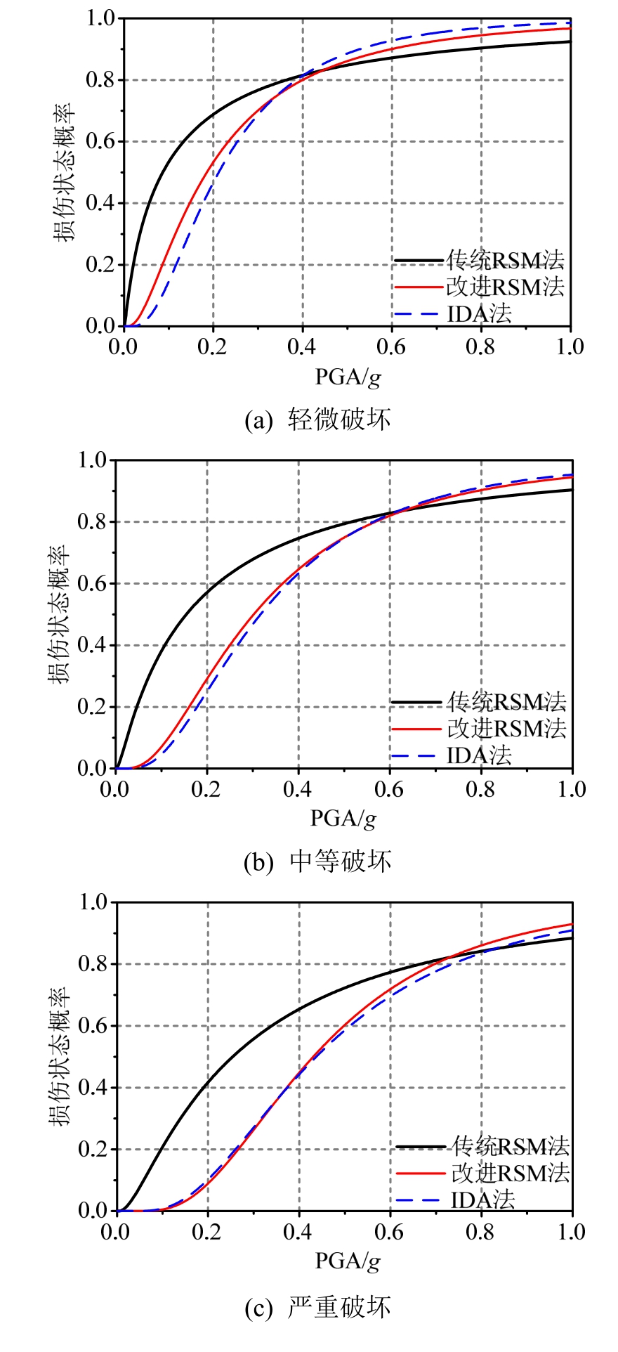 本文提出了一种基于响应面法的地震易损性分析方法,通过统计方法筛选出对桥梁地震响应影响较大的参数,采用最小二乘法回归生成不同地震动强度下的响应面函数,对生成的响应面函数进行蒙特卡罗抽样,计算其对应不同损伤状态下的失效概率,并将计算结果与IDA法及传统响应面法计算得到的易损性结果进行比较。具体结论如下。