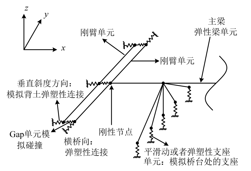 本文考虑了桥跨之间及边跨与桥台间的碰撞效应,通过在桥台与边跨之间以及桥跨之间设置间隙单元来模拟该效应。为了简化计算成本,基础部分不考虑桩土效应对桥梁地震响应的影响,墩底采用固接模拟。