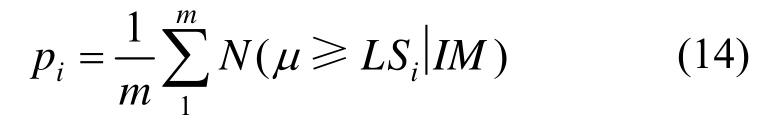 地震易损性是指在不同地震动强度作用下结构或构件的抗震需求超过其抗震能力的概率。本文通过生成不同 PGA下的响应面方程,根据输入参数的分布类型结合蒙特卡罗抽样得到各 PGA下各损伤构件的地震响应,并通过表7给定的损伤指标判定构件的损伤状态,统计各类损伤状态的频数再除以抽样次数,即可得到构件在各 PGA下不同损伤状态的概率,如式(14)所示: