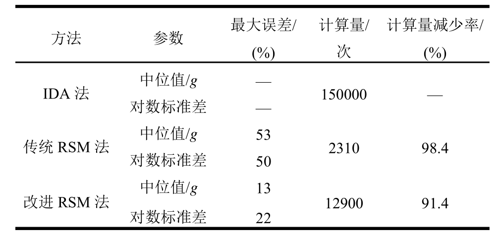 本文以IDA法生成的易损性曲线为基准,分别构建传统响应面法与改进响应面法的易损性曲线,如图6所示,并给出了易损性曲线的两个判定指标中位值和对数标准差,如表8所示。表9对比了三种不同方法构件易损性曲线的计算量,并以IDA法为基准,比较中位值和对数标准差的误差与计算量的减少比率。