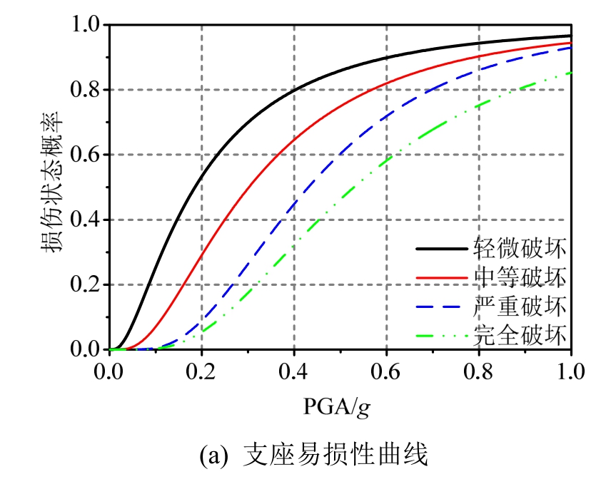 本文采用对数正态分布函数作为地震易损性函数,通过最小二乘法回归出构件的易损性参数,并假定桥梁系统的损伤等级为构件的最大损伤等级,计算每个PGA下桥梁系统的损伤概率。由图5可知,相同 PGA作用下支座的损伤概率最大,桥台损伤的概率最小,这对桥梁地震加固具有一定的指导意义。