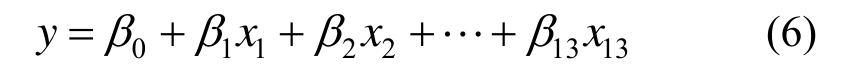 基于Plackett-Burman设计生成桥梁样本,通过系统的改变输入参数计算相应的地震响应,确定各参数对简支梁桥的地震响应的影响。式(6)为通过最小二乘法回归出桥梁能力保护构件的最大地震响应与 13个桥梁参数的一阶线性方程,得到所选的参数与构件响应之间的相关系数: