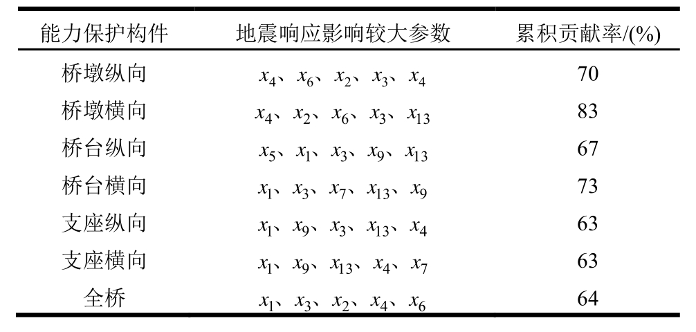 虽然任何输入参数的变化都会引起桥梁结构响应输出的不同,但由表3和表4可知:对于桥梁的各个能力保护构件的地震响应的最大影响参数其绝大多数是结构参数,材料参数占的比重很小;从全桥的地震响应来考虑,筛选出的5个参数都是结构参数,即结构参数对桥梁的地震响应的影响比材料参数大,这与既往研究结果较为一致[10]。