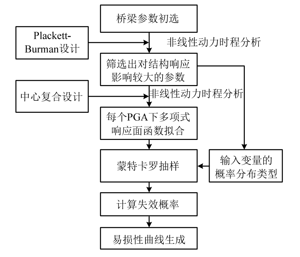 为了克服以往研究中响应面函数对地震响应预测精度的不足,本文提出一种改进的响应面方法。采用Plackett-Burman设计方法[14]生成一系列桥梁样本并进行非线性时程分析,采用最小二乘法回归出地震响应与结构和材料等13个不同桥梁参数的一阶线性回归方程,筛选出影响桥梁地震响应的显著性参数,并假定这些显著性参数的分布类型。针对刷选出来的显著性参数进行中心复合设计,同时将地震动强度指标从不确定性参数中独立出来,建立桥梁各构件在不同地震动强度下的响应面函数模型。在此基础上结合蒙特卡罗抽样得到桥梁能力保护构件在不同地震动强度下的损伤概率,并采用最小二乘法回归出易损性曲线。具体流程如图1所示。