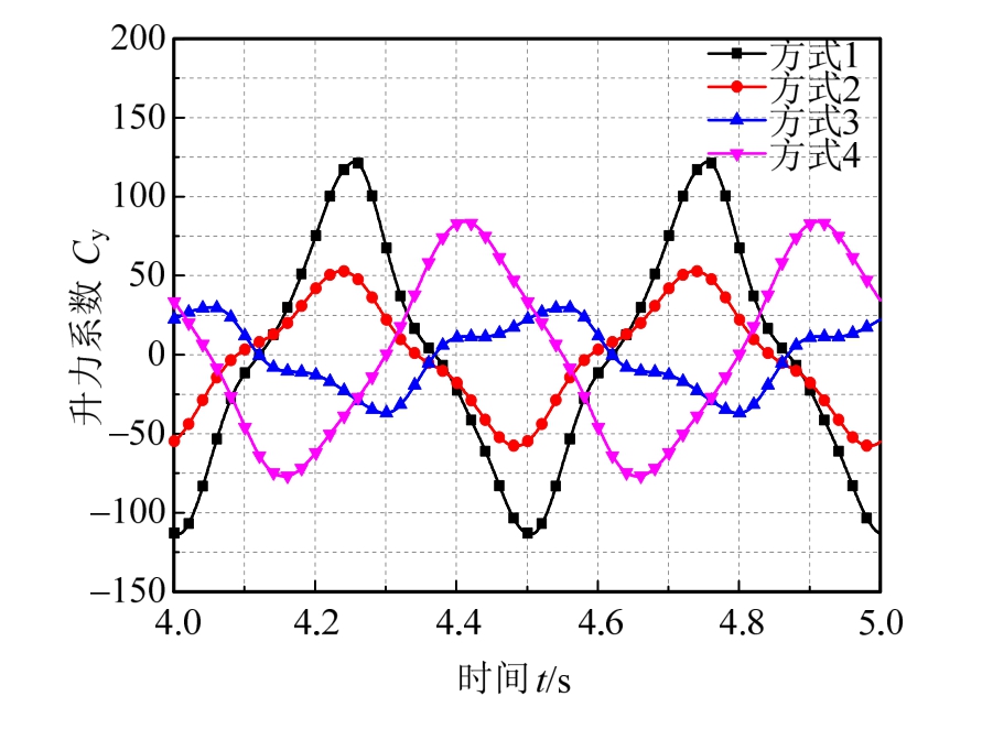(2) 四种扑动方式所产生的升力在一个扑动周期均为一个变化周期,四种方式均近似为余弦变化规律,主变化频率等与扑动频率;四种扑动方式所产生的平均升力均几乎为0,方式1产生的升力峰值最大,方式3产生的升力峰值最小。