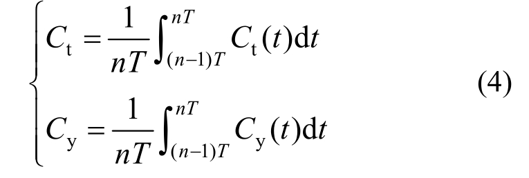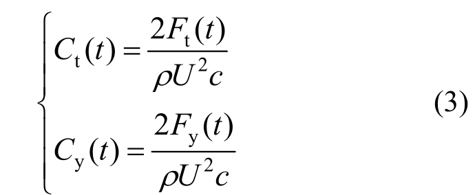 式中:Ft(t)为水平方向瞬时推力;Fy(t)为竖直方向瞬时升力。平均推力系数及升力系数定义为: