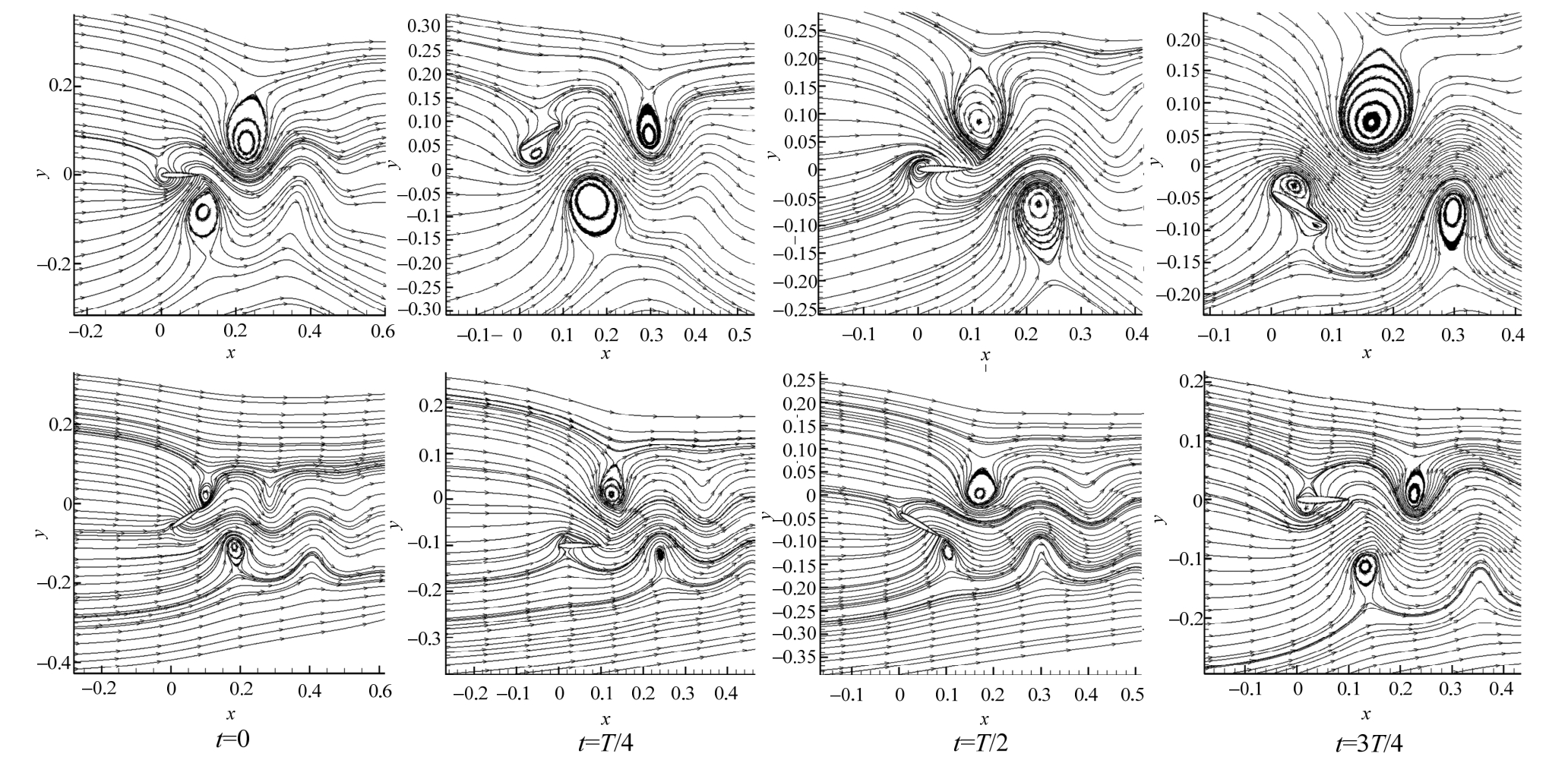 Fig.8 The streamline of mode one and three at different moments (upper: mode one; bottom: mode three)