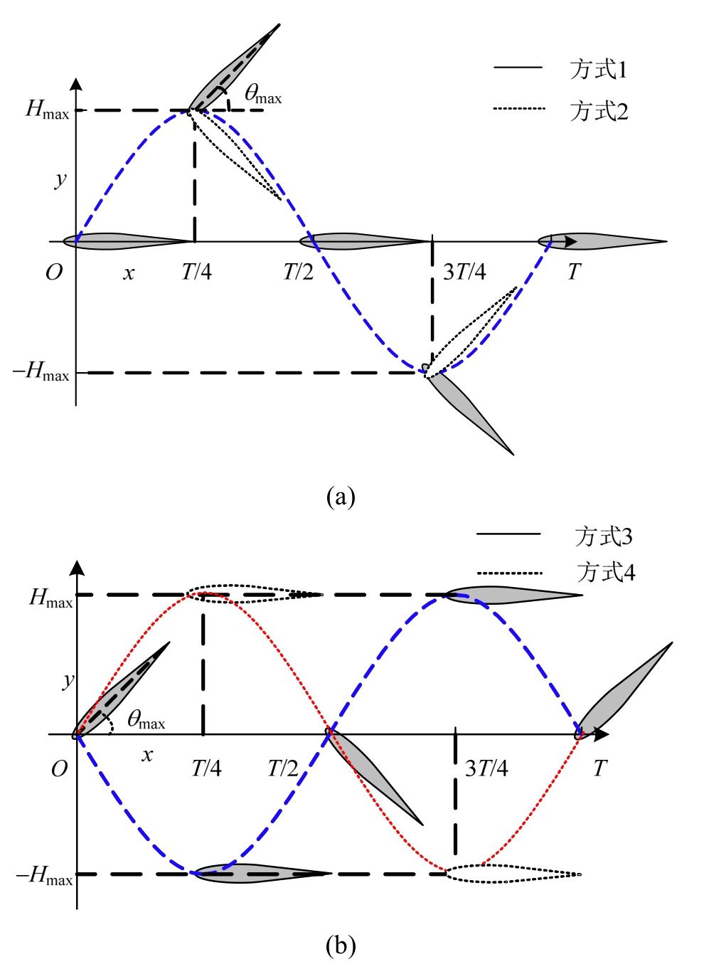 扑翼的扑动是一种结合上下拍动及俯仰运动的二自由度运动方式,主要根据上下拍动与俯仰运动的方向分为四种运动方式,图1所示为一个周期内四种扑动方式的二维示意图。