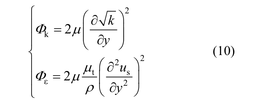 式中,右端项分别为生成项、耗散项以及壁面项。式中各常数定义为![]()