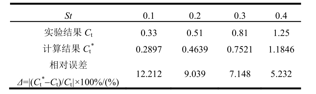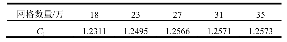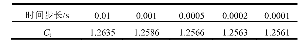 在进行 CFD非定常数值计算过程中,流场网格划分疏密程度以及时间步长的选择都会对计算结果造成很大的影响,因此需要对网格无关性及时间步长无关性进行验证,使计算结果更加准确与可靠。表2为不同网格数目对应的平均推力系数,可以看出当网格数目达到27万的时候,计算结果已经不受影响,因此后文计算中采取27万网格对应的设置参数进行网格划分。表3为不同时间步长所对应的平均推力系数,可以看出当时间步长为0.0005 s时,计算结果收敛,故本文所选时间步长为0.0005 s。基于上述数值无关性验证,选择与麻省理工学院(MIT)[15]相同的工况进行数值计算,对比结果如表4所示,发现随着St的增大相对误差逐渐减小,最大相对误差为12.212%,最小相对误差为5.232%,由于St=0.1时推力系数较小,故出现较大误差在许可范围内,因此所建计算模型的计算结果是可靠的。