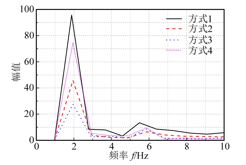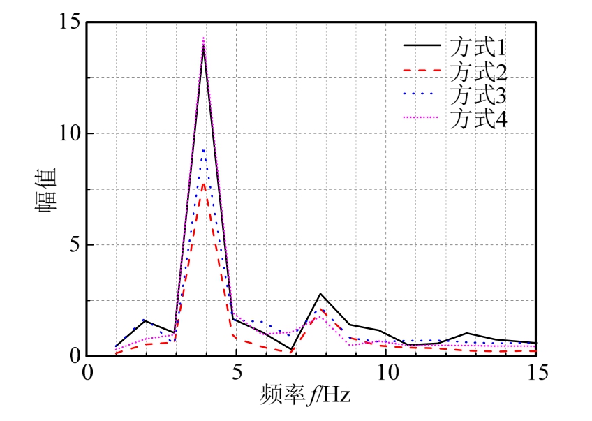 为了更深入探索推力系数变化规律,对推力系数进行快速傅氏变换(FFT)转换,为了对比明显,取分析频率段为0 Hz~15 Hz,分析其频域特性,如图5所示。可以看出四种扑动方式对应的推力系数变化频率几乎一致,主频率均为4 Hz,是扑动频率的2倍,这也与已有文献的结果是一致的。方式1与方式4对应的主幅值最大,且近乎相等,方式2幅值最小,这也与图4的结果是对应的。由此可以看出,对于推力特性,四种扑动方式的推进特性对比明显,推力变化均近似呈余弦型变化规律,且变化频率近乎一致,主频率为扑动频率的2倍。方式3推力特性最好,方式1次之,方式2与方式4总体不产生推力。