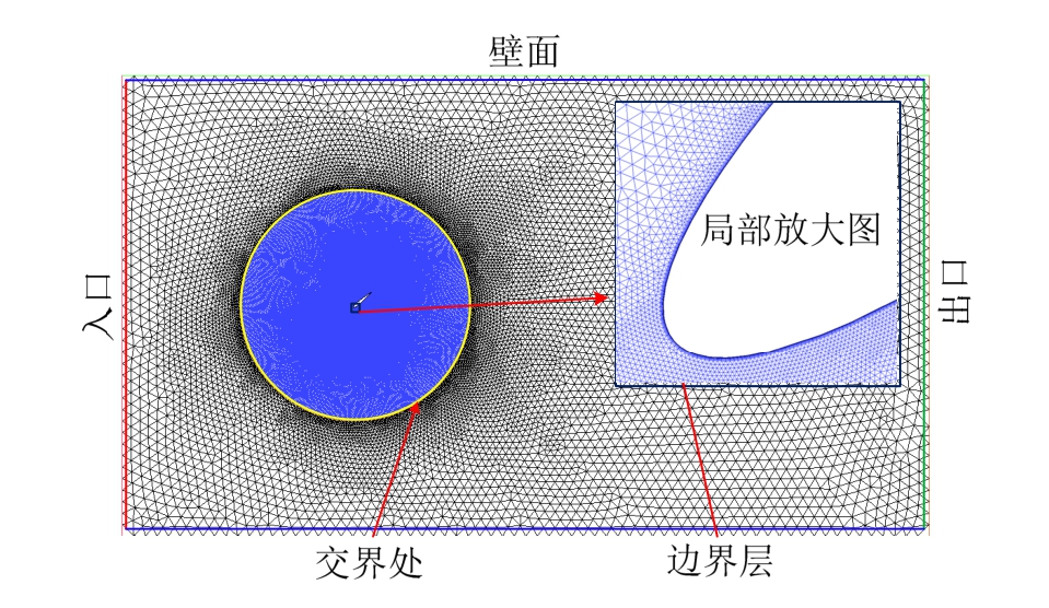 计算域尺寸及远场边界条件对计算结果的影响不可忽略,如表1所示为不同计算域尺寸对计算结果的影响,故本文选择计算域尺寸为40c×20c。由于扑翼需要按规律进行扑动,故需要结合动网格技术进行数值计算。为了提高计算效率,特将计算域分为内外域两部分,内域为半径为5c的圆形区域。整个计算域均进行非结构化三角形网格划分,为了提高计算精度,对内域进行更小尺度的网格划分。在翼型周围划分边界层以便更好地捕获边界层流场,第一层网格厚度为0.0001c。计算域及初始时刻有俯仰角的网格划分如图2所示。