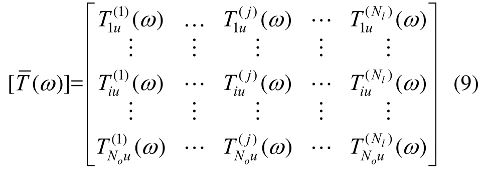 Devriendt等[53]基于传递比的工作模态参数识别技术,成功地将局部传递比函数拓展到传递比矩阵。文章通过“虚拟局部传递比函数”巧妙地将多点激励下传递比矩阵和局部传递比函数联系在一起。研究发现“虚拟局部传递比函数”具有在系统极点处与外部激励无关的性质: