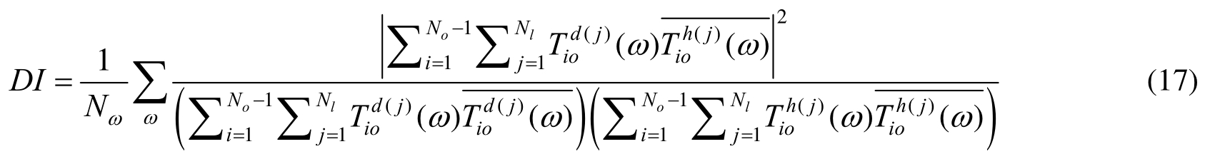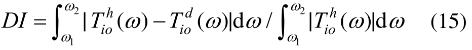 美国航空航天局的Schulz研究组将结构无损状态以及损伤状态对应的传递比函数的差值在固定频带[ω1,ω2]内进行积分,对该积分归一化后得到了新的损伤指标[20,29―31]: