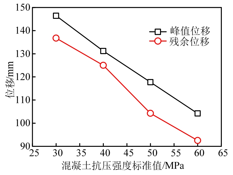 为研究核心混凝土抗压强度对试件变形的影响,保持其他因素不变,取混凝土抗压强度标准值分别为30MPa、40MPa、50MPa、60MPa进行对比分析,图15给出了不同混凝土抗压强度下柱中点水平位移时程曲线,图16给出了峰值位移和残余位移随混凝土抗压强度变化曲线。由图15、图16可知,随混凝土抗压强度提高,钢管混凝土墩柱中水平位移减小,当混凝土抗压强度标准值在30MPa~60MPa变化时,峰值位移及残余位移随抗压强度的增大基本呈线性递减趋势。强度等级的提高使得混凝土的抗压、抗拉强度均提高,在相同的爆炸荷载作用下,核心混凝土进入塑性的区域显著减少,从而有效降低柱中变形量。