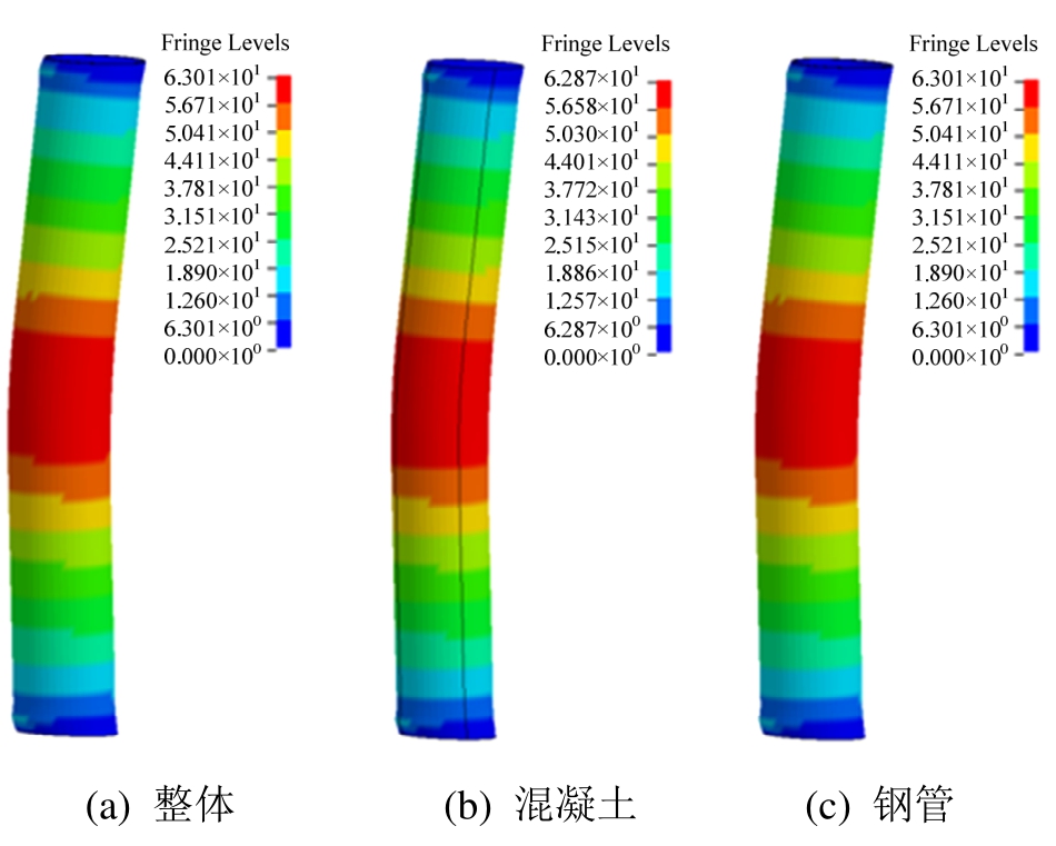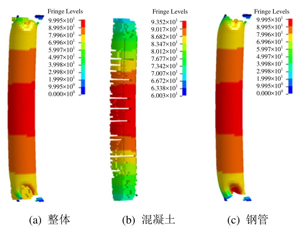 基于已建立的数值模拟方法,结合试验模型,研究钢管混凝土墩柱在不同类型爆炸荷载作用下的破坏形态。取典型钢管混凝土墩柱柱高为1800mm,钢管外径为273 mm,壁厚为7 mm,柱顶约束三向位移,柱脚约束三向位移及转角。基于大量数值模拟,图10、图11、图12给出了典型柱在爆炸荷载作用下发生的三种破坏模式以及各组成部分的破坏形态,分别是弯曲破坏、剪切破坏和弯剪破坏。弯曲破坏对应的荷载工况为:峰值反射超压25 MPa,正压持时10ms;剪切破坏对应的爆炸荷载为:峰值反射超压为800MPa,正压持续时间为0.3 ms;弯剪破坏对应的爆炸荷载为:峰值反射超压为100MPa,正压持时为2 ms。