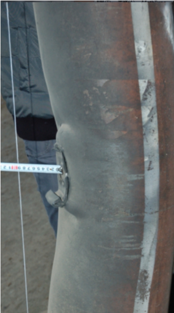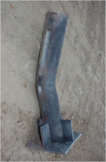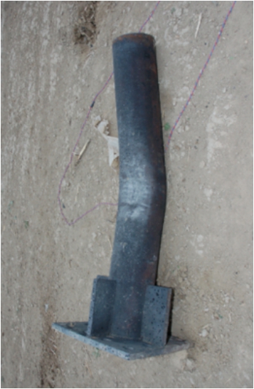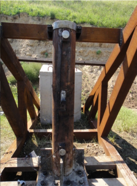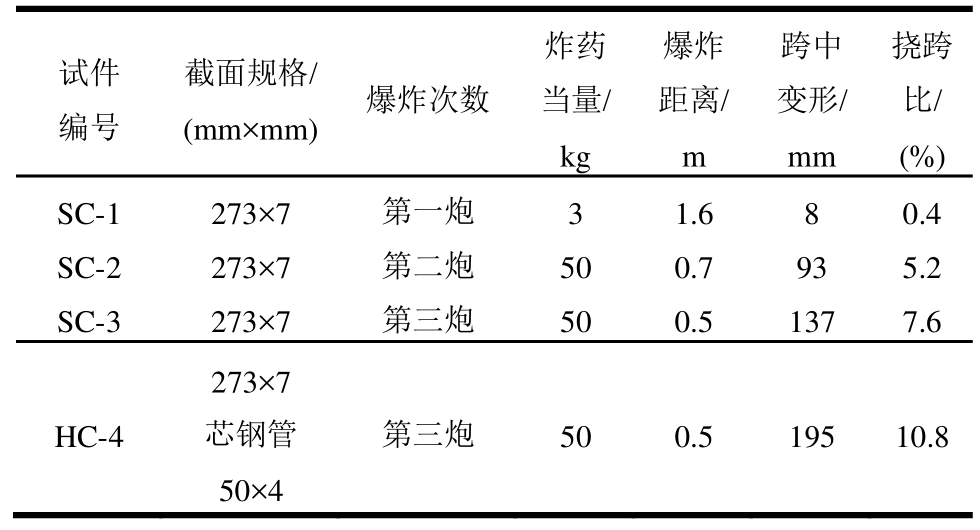 第一发试验中,3kgTNT引爆后产生爆炸火球(图4),火球最高温度约为2000℃左右,通过V5.2高速摄像机观察得到火烧持续时间为142 s。SC-1比例距离为1.1 m/kg1/3,构件呈现整体弯曲变形(图5),柱中残余变形量为8 mm,挠跨比为0.4%,反力系统完好。第二发50kg TNT静爆试验中,SC-2比例距离为0.19 m/kg1/3,构件受爆后呈现整体弯曲变形特征(图6),最大残余变形为93 mm,挠跨比为5.2%,柱底与节点板连接处焊缝被撕裂,组成反力系统的方形钢管发生局部塑性凹曲变形,反力系统受爆后整体性能良好。第三发试验中,比例距离为0.14 m/kg1/3的普通钢管混凝土墩柱SC-3和复式中空钢管混凝土墩柱HC-4均发生整体弯曲变形,测得SC-3柱中残余变形为137 mm(图7),HC-4柱中残余变形为195 mm(图8)。柱中内部混凝土被压碎,柱脚底板产生轻微翘曲变形,柱脚节点焊缝未发生开裂和撕脱,反力系统支撑良好。相同约束条件、相同外径下,试件HC-4柱中残余变形大于试件SC-4柱中残余变形,且增幅为42%,说明中空的截面形式削弱了普通圆形截面钢管混凝土的整体刚度,降低了其抵抗变形的能力。