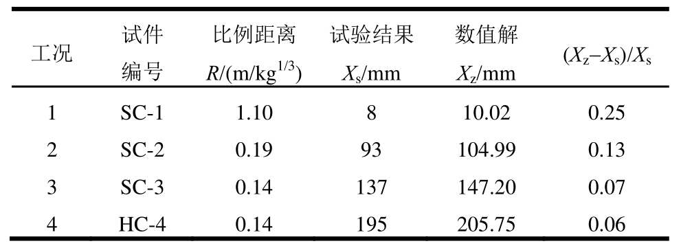 为验证数值模型的合理性,对三次静爆试验中的4种工况进行了动态响应模拟,将受爆后柱中残余变形的数值模拟结果与试验结果进行比较(表5)。由于数值模型中通过定义关键字*RIGIDWALL_PLANAR产生刚性平面,以考虑地面反射的影响,而试验中爆心以及周围的地面情况属于土质而非完全刚性无穷大反射面,因此,4种工况的柱中残余变形的数值解比试验结果大,但随着比例距离的减小,误差减小。4种工况数值解的误差平均值为0.13,与试验结果基本吻合良好。