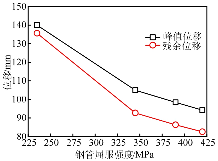为研究钢管屈服强度对试件变形的影响,保持其他因素不变,钢管屈服强度分别取为235 MPa、345 MPa、390MPa、420MPa进行对比分析,图17给出了不同钢材屈服强度柱中点水平位移时程曲线,图18给出了峰值位移和残余位移随钢管屈服强度变化曲线,整体上,随钢管屈服强度的提高,柱中峰值位移与残余位移均呈递减趋势,当屈服强度取为345 MPa、390MPa、420MPa时,柱中水平残余位移分别为91.73 mm、86.06 mm、82.41 mm,但是当屈服强度为235 MPa时,柱中水平残余位移增加至135.70mm,变化率较大。说明提高外钢管的屈服强度对提高钢管混凝土墩柱的抗爆性能有一定的局限性,当外钢管强度较低时,提高钢管强度有积极意义,当钢管强度等级≥345 MPa时,增大钢管屈服强度对提高抗爆性能影响不明显。