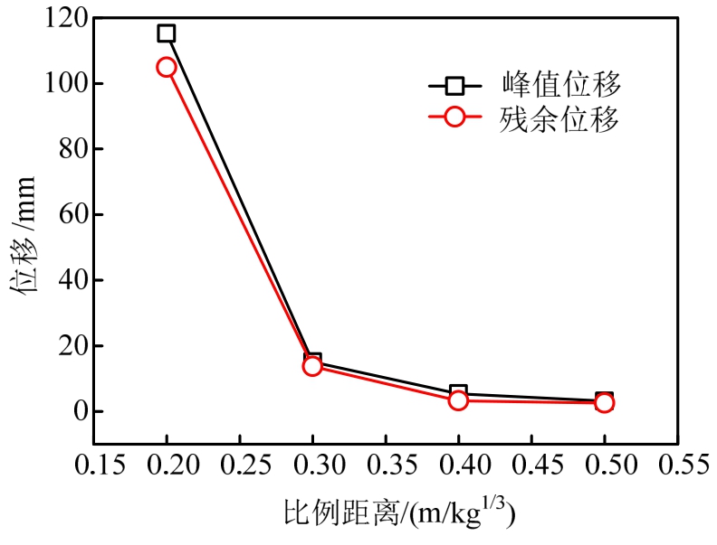 保持炸药当量50kg及其他因素不变,通过调整爆心与构件之间的实际距离改变比例距离,爆距与对应的比例距离见表7,得到不同比例距离下钢管混凝土墩柱中点位移时程曲线(图13)以及峰值位移和残余位移随比例距离变化曲线(图14)。由图13、图14可知,随着爆距的增大,比例距离增大,柱中点的水平峰值位移及残余位移减小,当比例距离大于0.3 m/kg1/3时,随比例距离增大,柱中位移变化率减小,当比例距离大于0.4 m/kg1/3时,柱中变形不明显。比例距离为0.3 m/kg1/3时,残余位移为13.00mm,比例距离为0.2 m/kg1/3时,残余位移达到105.00mm,可见,小比例距离(z<0.3 m/kg1/3)对峰值位移以及残余变形的影响较为敏感。