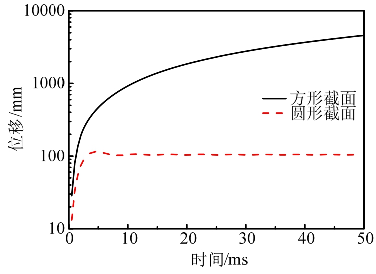 为比较截面形状对试件动态响应的影响,选取方形和圆形两种截面形式的钢管混凝土墩柱为研究对象,使方柱的边长等于圆柱的直径,取值为273 mm,保持工况2的其他试验参数不变。由图21可知,相同爆炸荷载作用下,圆柱发生弯曲破坏,最大残余位移为105 mm,方柱呈现出柱顶和柱脚严重的剪切破坏,构件丧失承载力。尽管方形柱比圆柱有近似于两倍的截面惯性矩,但是方形的柱截面不利于爆炸波的绕射,容易导致冲击波在局部区域集中并对墩柱产生较大的危害。因此,圆形截面柱有较强的抵御爆炸荷载的能力。