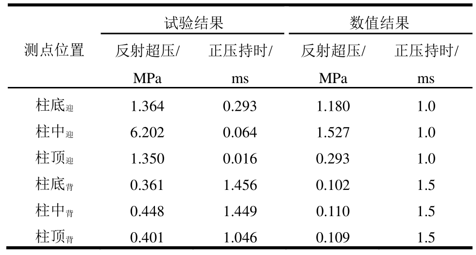 将柱面反射超压的数值模拟结果与超压测点测试结果进行对比(表6),位于迎爆面柱底测点的反射超压峰值数值模拟结果为1.180MPa,试验结果为1.364 MPa,误差为13%,正压持时的数值解为接近1 ms,试验结果为0.293 ms,由于基数较小,对于静爆类试验该误差属于合理范围;迎爆面柱中超压峰值实测值为6.202 MPa,数值解为1.527 MPa,正压持时试验结果为0.064 ms,数值解为接近1 ms;迎爆面柱顶超压实测值为1.35 MPa,数值解为0.293 MPa,正压持时试验结果为0.016 ms,数值解为接近1 ms;这样的误差是由于试验场地为空旷靶场,地面反射面为视为无限大,因此经过地面反射所加强的反射波所影响区域更大,对柱底、柱中及柱顶均有较强影响,而数值模型中,由于计算资源的制约,建立空气域大小相对有限,因此爆炸冲击波与有限大小反射面发生作用时的影响区域相对较小,仅在柱底处的反射超压增强现象较为明显,而位于柱中以及柱顶处的超压增强现象则相对较弱。背爆面的峰值超压的试验值与模拟结果在同一量级,正压持时误差平均值仅为3%。由此可见,该文确立的流固耦合数值模拟方法对预测迎爆面柱底、背爆面超压分布及柱中残余变形有较好的参考价值。