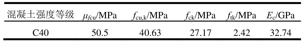 注:μfcu为立方体抗压强度平均值;fcu,k为混凝土立方体抗压强度标准值;fck为混凝土轴心抗压强度标准值;ftk为混凝土轴心抗拉强度标准值;Ec为混凝土弹性模量。