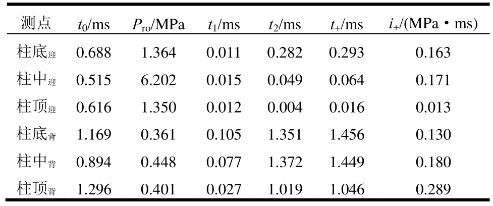 第一发3kg TNT静爆试验中,在试件迎爆面及背爆面的柱底、柱中、柱顶分别布设6个超压传感器,柱底测点距离地面0.38 m,柱中测点与爆心等高,顶部测点距地面1.7m。50kg TNT大药量试验由于炸药安置距离较近,破坏性较大,未布设柱面超压传感器。试验结果见表4,结果表明迎爆面超压分布不均匀,与爆心等高处超压峰值达6.202 MPa,柱顶、柱底两处较小分别为1.350MPa和1.364 MPa,约为柱中超压的1/4,背爆面超压沿柱高分布均匀,从柱底到柱顶分别为0.361 MPa,0.448 MPa,0.401 MPa,比迎爆面小一个数量级。