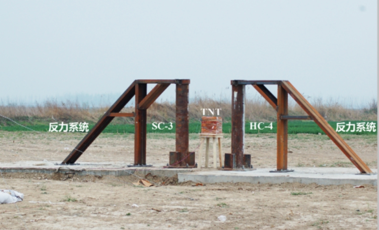 静爆试验现场布置见图1、图2和图3。试件固定于钢结构靶板支撑架-钢筋混凝土配重块形成生冲击波实现爆炸荷载的施加,断靶线断裂触发数据采集系统工作。炸药安置于距离地面0.9 m高度的反力约束体系中。试验通过引燃裸TNT药块产处,属于地面爆炸类型。共确定4个主要工况,进行了3发4工况的静爆试验,工况具体参数见表1。