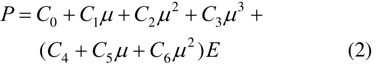 式中:E为炸药的初始比内能,即单位体积内能;V为相对体积,即爆轰产物体积与炸药初始体积之比。线性多项式状态方程用于空气时,C0=-0.1,C1=C2=C3=C6=0,C4=C5=γ-1,μ=ρ/ρ0-1,ρ0、ρ和γ分别为气体的初始密度、密度和绝热指数。