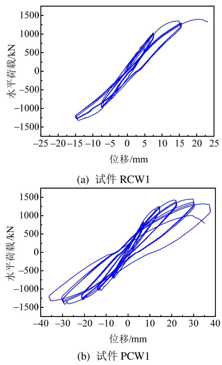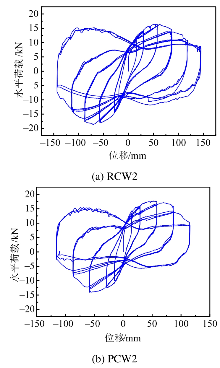 2片剪力墙试件的滞回曲线和骨架曲线分别如图4和图5所示,由图中可见: