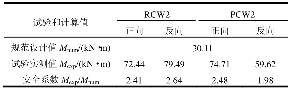 基于现行规范计算得到的2片剪力墙的正截面抗弯承载力设计值与剪力墙试件的抗弯承载力试验值对比见表5。2片剪力墙试件的正反向抗弯承载力安全系数在1.47~2.05之间,均具有较高的安全余量。