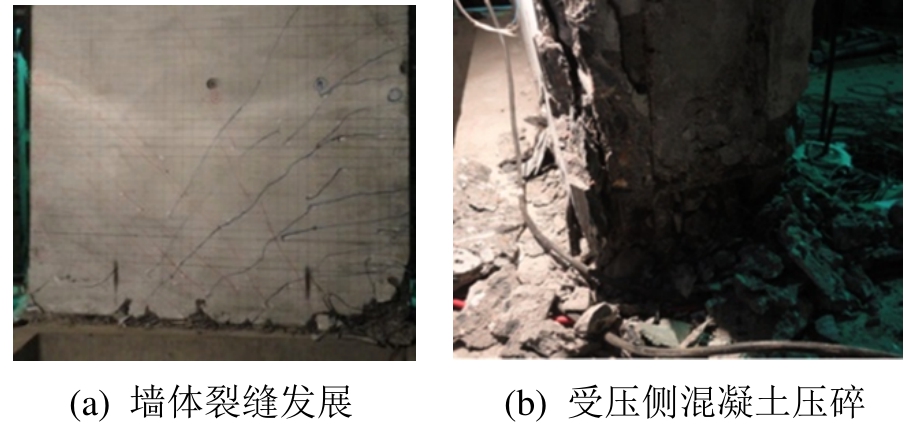 加载前期,裂缝主要分布在墙体的下部,为弯曲裂缝;随着水平位移的增加,墙体裂缝逐渐向上部发展;到加载后期,裂缝基本出齐,不断加宽并延伸,弯曲裂缝逐步发展成为剪切裂缝,双面叠合剪力墙预制板和底部坐浆层之间出现明显的缝隙(图3(a))。