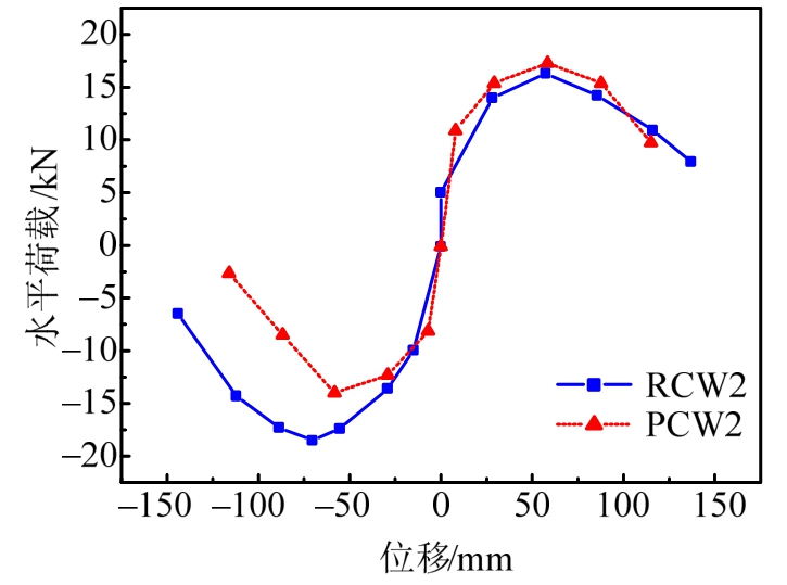 3)现浇剪力墙RCW2的极限承载力平均值为17.53 kN,双面叠合剪力墙PCW2的极限承载力(15.66 kN)比现浇试件低10.7%。