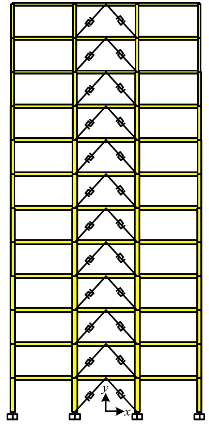6)阻尼器设计。选用摩擦阻尼器,利用2.2节阻尼器参数设计方法,Plastic(Wen)连接单元模拟摩擦阻尼器,主要力学参数包括屈服位移、初始刚度、屈服力(或起滑力)、屈服后刚度比和屈服指数。屈服后刚度比为阻尼器屈服后与屈服前的刚度之比,对于摩擦阻尼器取0。屈服指数是力-位移曲线中在屈服点附近的光滑过渡段范围,该值越大则过渡范围越小,通常取5~10之间,本文取10,结构各层摩擦阻尼器的力学参数见表6。阻尼器在中跨全高布置,每层两个,呈倒V型,如图8所示。