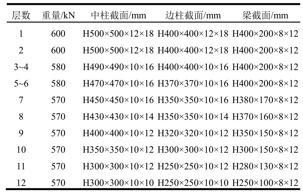 某12层钢框架结构按照强柱弱梁耗能机制进行承载力设计,模型平面图和立面图,如图3所示,抗震设防烈度为8度(0.2g),II类场地,设计地震分组为第二组(Tg=0.4 s)。梁和柱均采用焊接H型截面,Q235钢,构件具体尺寸见表2。楼屋面恒荷载为4.6 kN/m2,楼屋面活荷载为2.0kN/m2。在多遇地震下其层间位移角均满足《抗震规范》限值要求,罕遇地震下第10层、第11层层间位移角分别为1/49.8和1/49.3大于规范限值1/50,采用增设阻尼器的措施提高结构抗震性能。选择性能目标为罕遇地震下结构发生轻微损伤破坏,损伤指数取DM=0.21[25]。