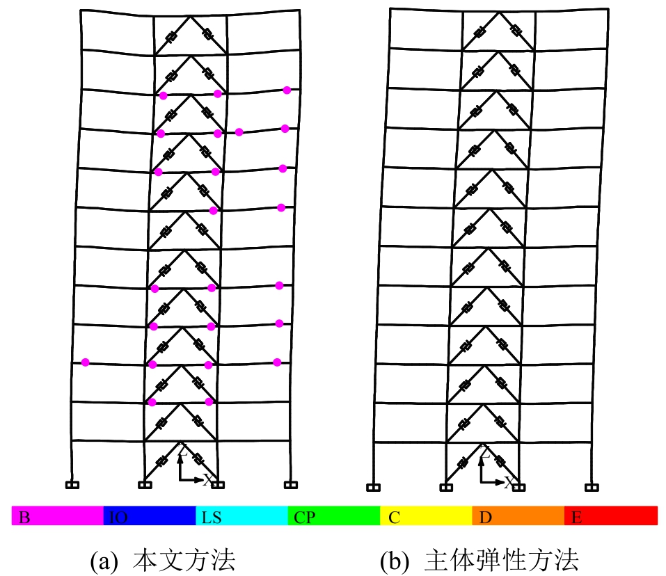 图10给出了罕遇地震结束时两种模型塑性铰分布情况,分析过程中采用FEMA356默认塑性铰机制,图例B代表塑性铰屈服,C代表结构失去承载力,IO、LS、CP分别代表直接使用、生命安全和防止倒塌抗震性能目标。本文方法塑性铰相对较多,共形成塑性铰24个,均处于屈服状态且集中在结构的中部;主体弹性方法无塑性铰。需要说明的是,虽然本文方法塑性铰比主体弹性方法多,但均处在屈服状态且均在梁中出现,对结构完成预定功能影响不大,此现象恰好验证了本文方法的准确性,达到了允许主结构部分构件进入塑性状态的设计目标。