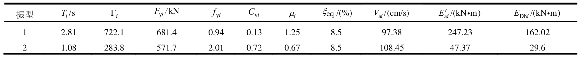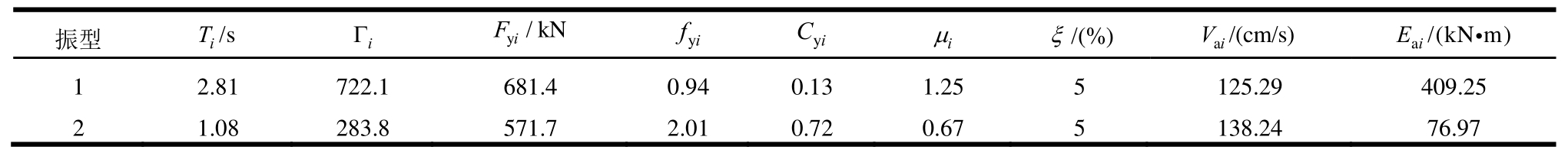 确定结构初始阻尼比ξ,本文取5%,由2.1节方法可求Vai、Eai,计算结果如下。