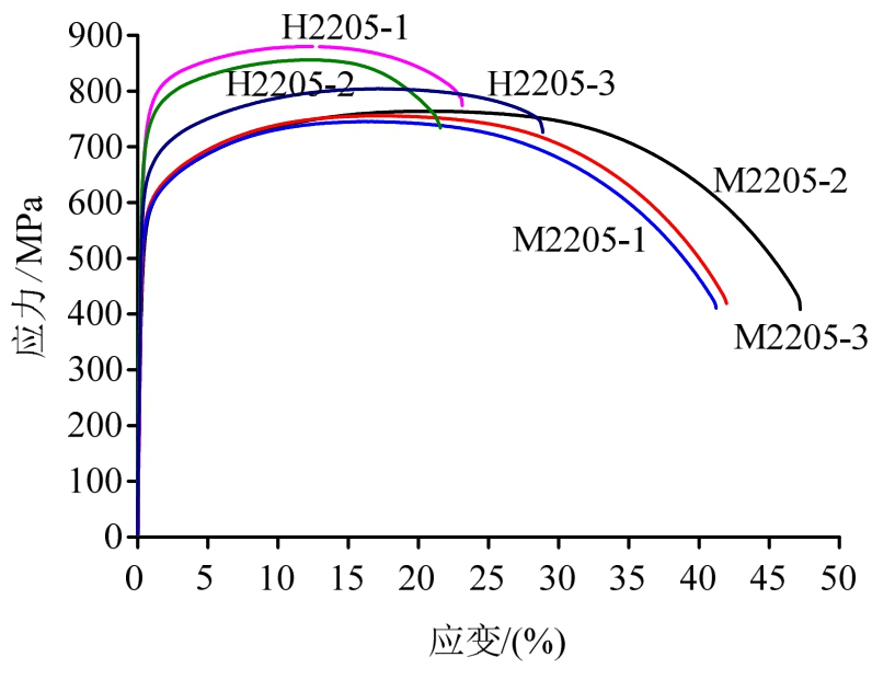 图5 双相型不锈钢母材及其焊缝金属试验曲线