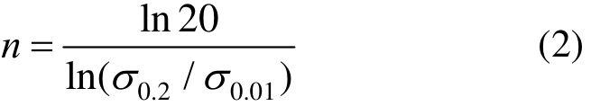 式中:E0为材料初始弹性模量;σ0.2为条件屈服极限,工程上通常采用残余应变为0.2%时所对应的应力;n为应变硬化指数,其取值可由式(2)确定。