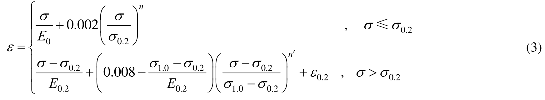 Ramberg和Osgood[12]提出了非线性金属材料本构关系模型,后经Hill[13]的不断改进,形成了目前常用的R-O本构关系模型,如下式所示: